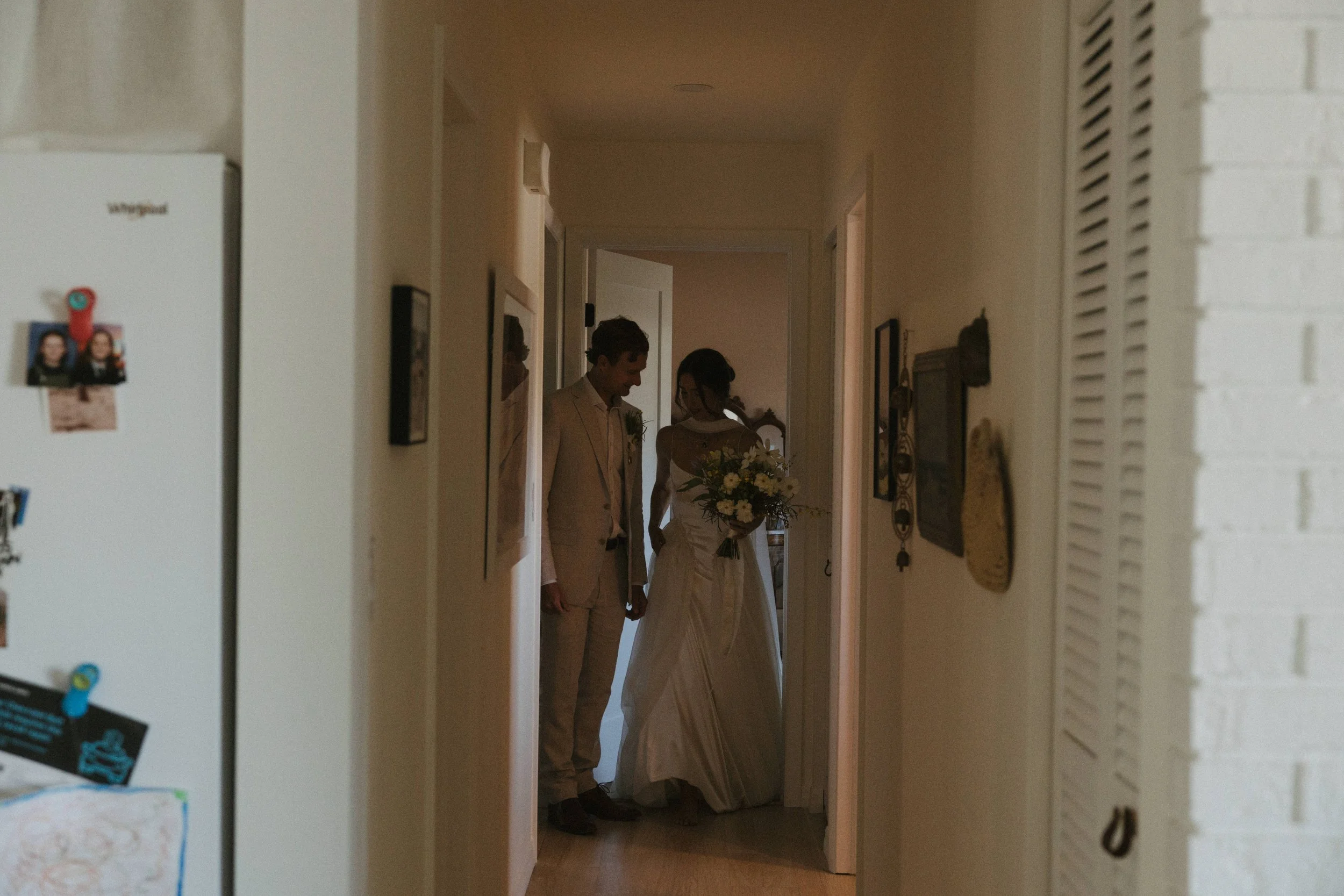 As the ceremony inched closer, Hannah did her makeup in her room while her sister helped with her hair, peeking out the window every so often to check on the yard’s progress. Across the hall, Travis showed off the embroidered details in his jacket while his sister helped steam his pants.